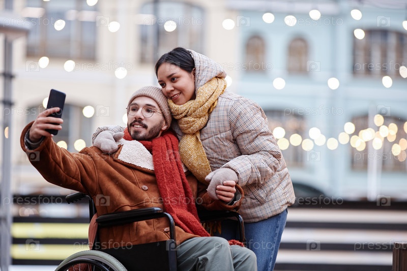Инклюзивная молодая пара фотографирует селфи на свежем воздухе