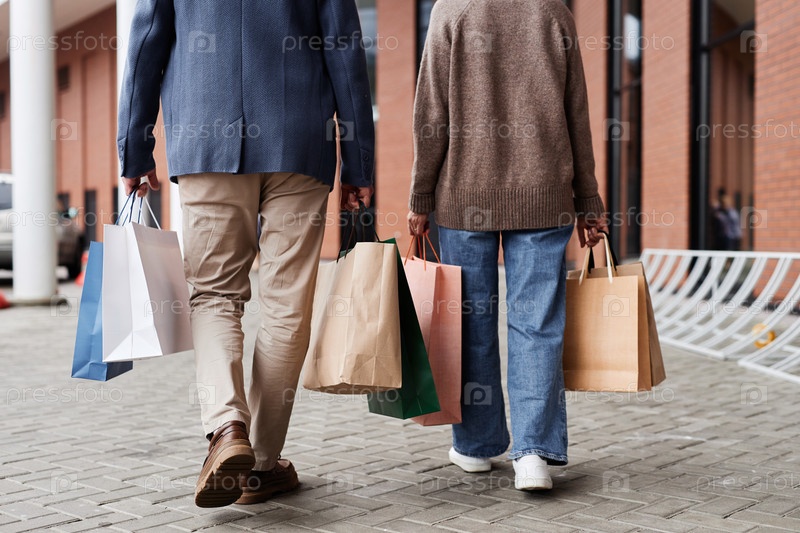 Задний вид пары с сумками для покупок, гуляющих вместе на открытом воздухе в торговом центре
