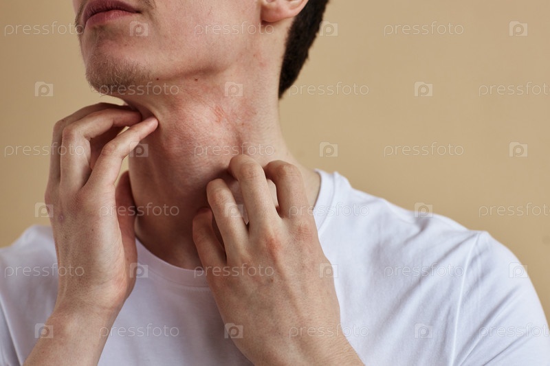 Ближайшее изображение человека, чесающего шею с зудом и аллергией