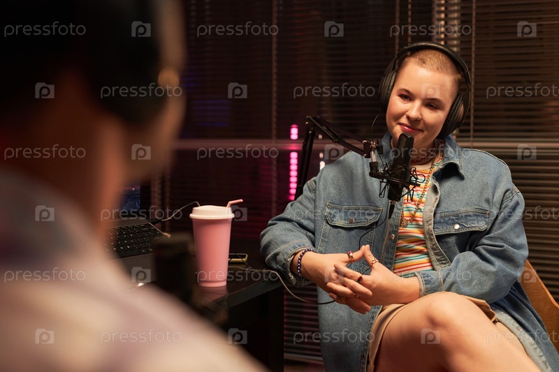 Улыбающаяся стильная девушка в подкастной комнате