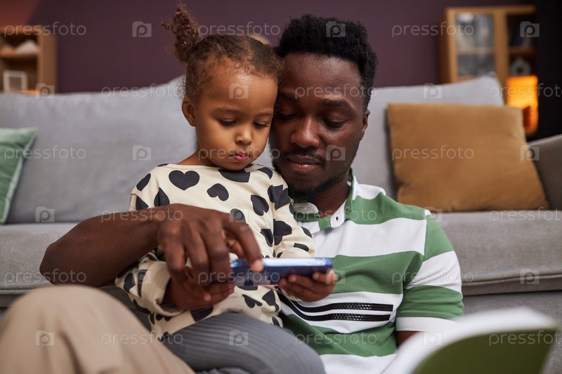 Чернокожий отец и дочь используют смартфон вместе