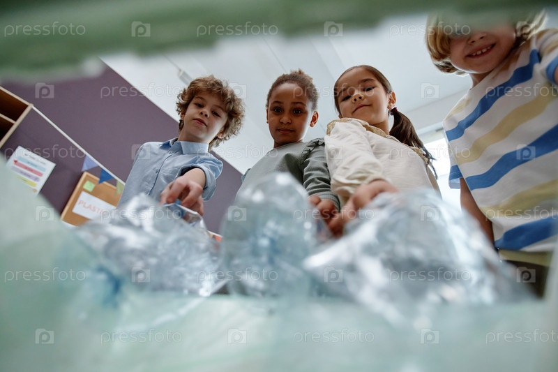 Дети кладут пластиковые бутылки в корзину для переработки POV