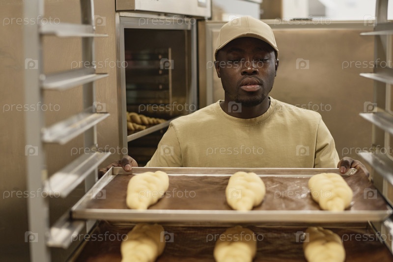 Чернокожий мужчина как работник в ремесленной пекарне, держащий поднос с свежим хлебом