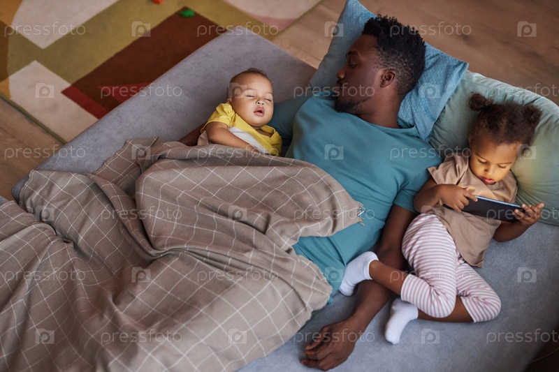 Усталый чернокожий отец спит с двумя маленькими детьми во время сна