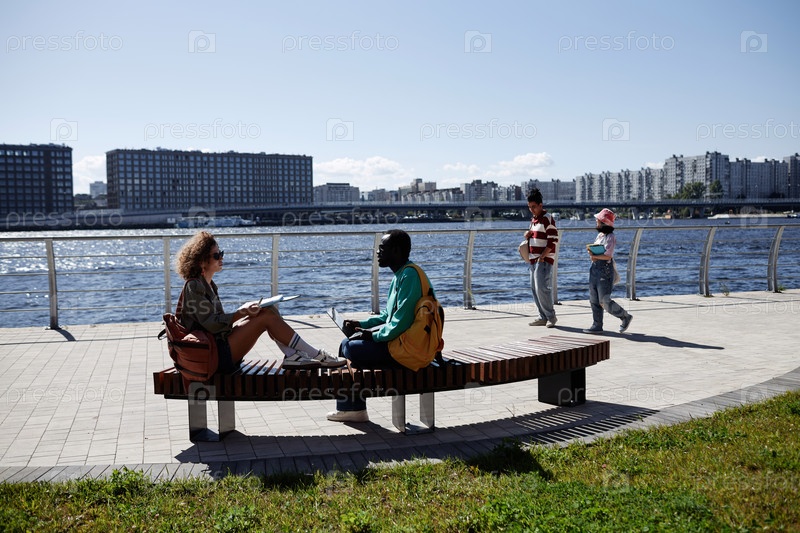 Группа молодых людей, отдыхающих в парке у реки на открытом воздухе с голубым небом