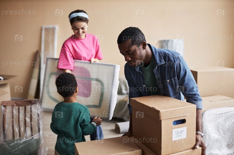 Молодой афроамериканец кладет картонную коробку на другую