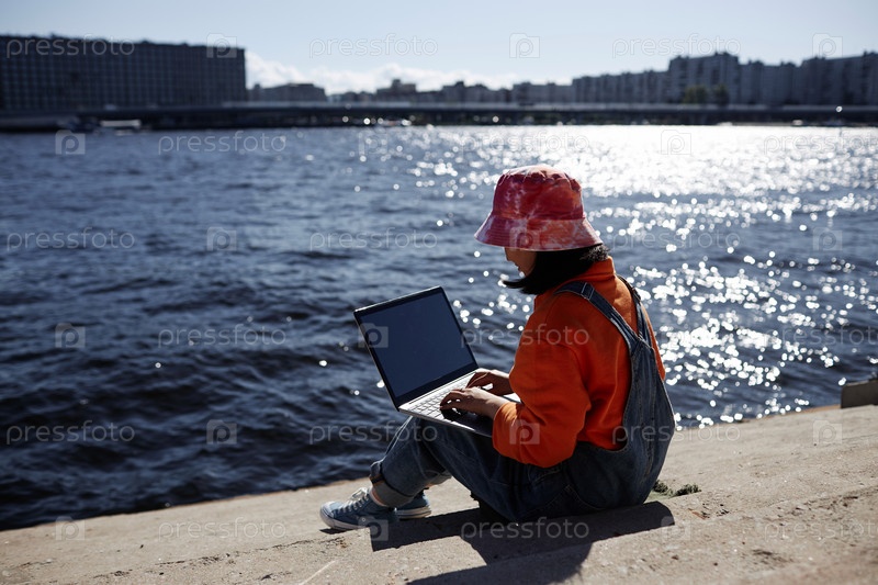 Девушка, использующая ноутбук во время учебы у реки