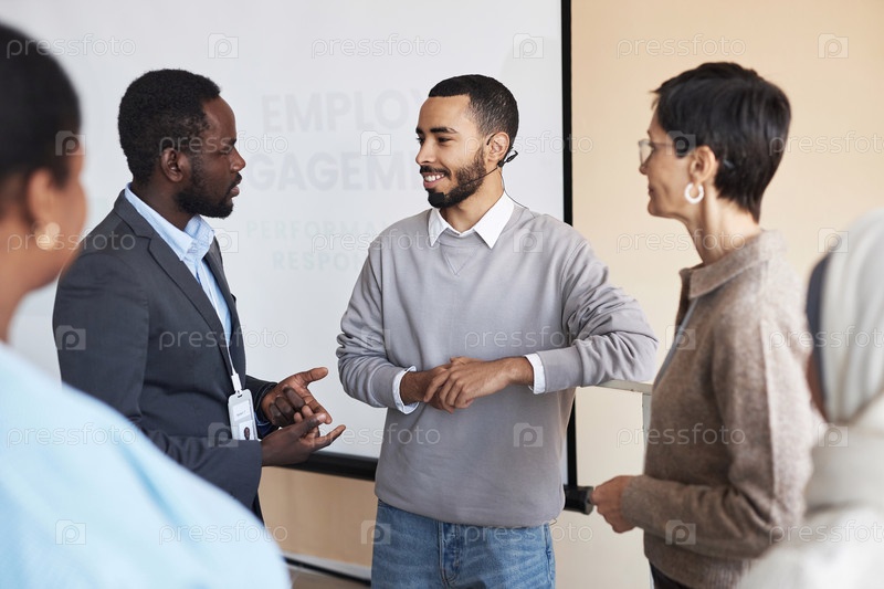 Молодой уверенный в себе афроамериканский делегат объясняет что-то