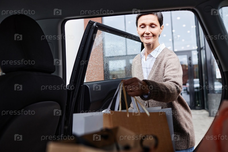 Улыбающаяся женщина загружает бумажные пакеты в машину возле торгового центра