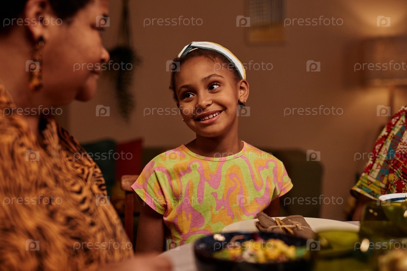 Девушка разговаривает с матерью на ужине Kwanzaa