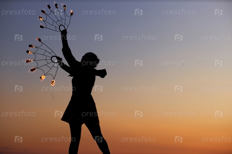 Описание Женщина танцует с огненными вентиляторами на Sunset Sky