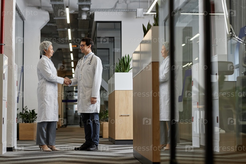Два зрелых межнациональных врача в лабораторных халатах, пожавшие руки на коридоре больницы
