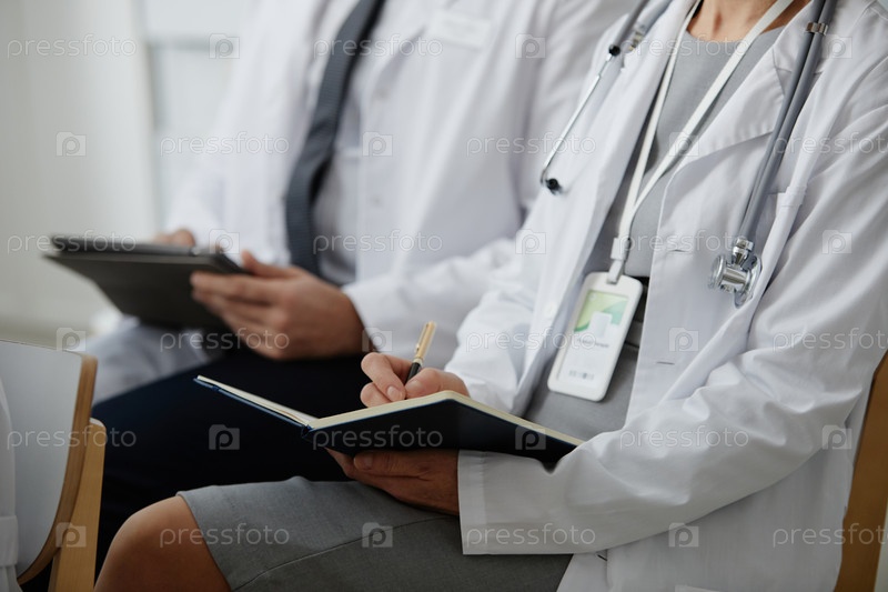 Близкий снимок врачей в аудитории, которые делают заметки
