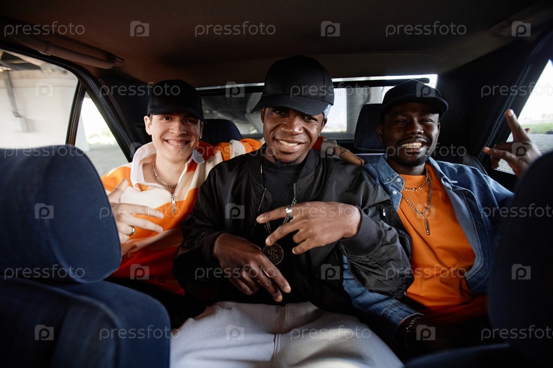Три счастливых молодых межкультурных приятеля в модной одежде, сидящих на заднем сиденье