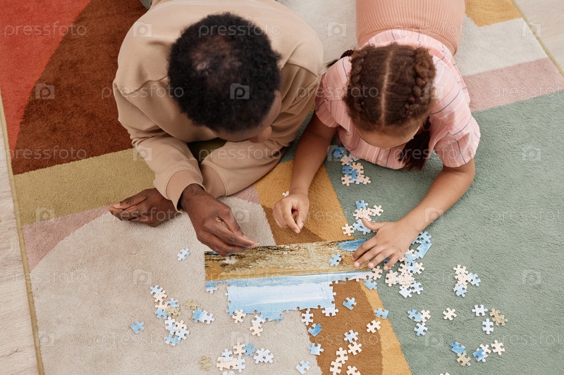 Верхний вид Черный отец и дочь играют с головоломкой