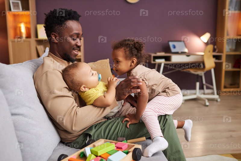 Счастливый афроамериканский отец, играющий с двумя маленькими детьми