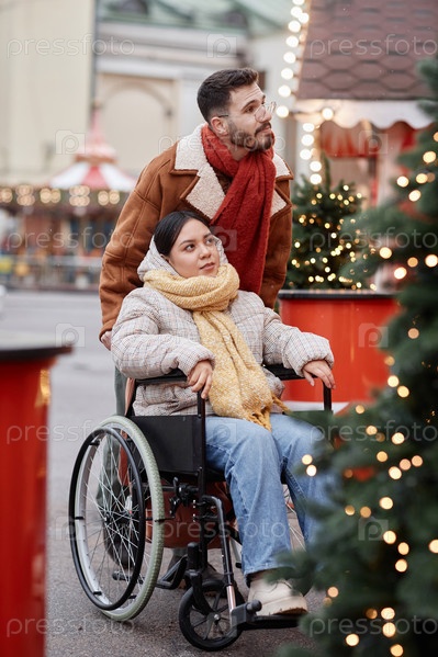 Молодой человек помогает своей девушке-инвалиду на рождественском рынке