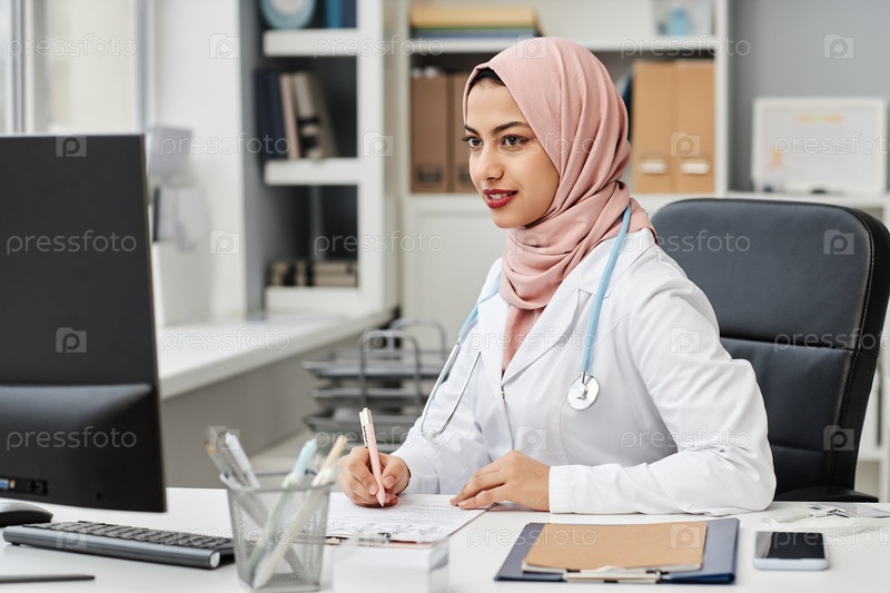 Доктор использует компьютер для онлайн-встречи с мусульманами