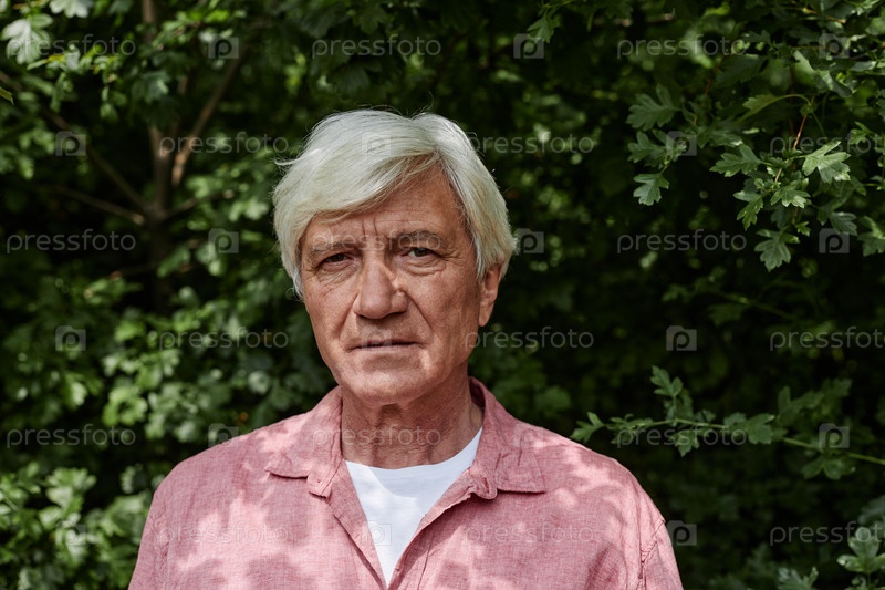 Пожилой мужчина смотрит на камеру против зелени на открытом воздухе