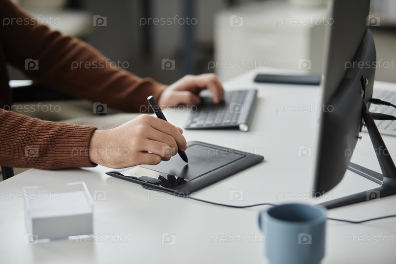 Близкий снимок человека, использующего ручку-таблет для редактирования фотографий или видео на столе в офисе
