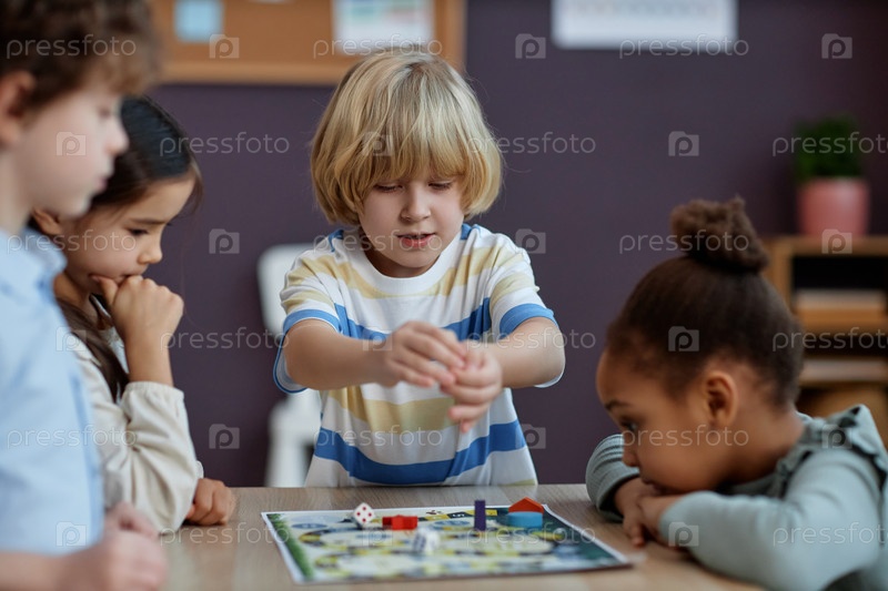 Разнообразная группа маленьких детей, играющих в настольные игры вместе в дошкольном