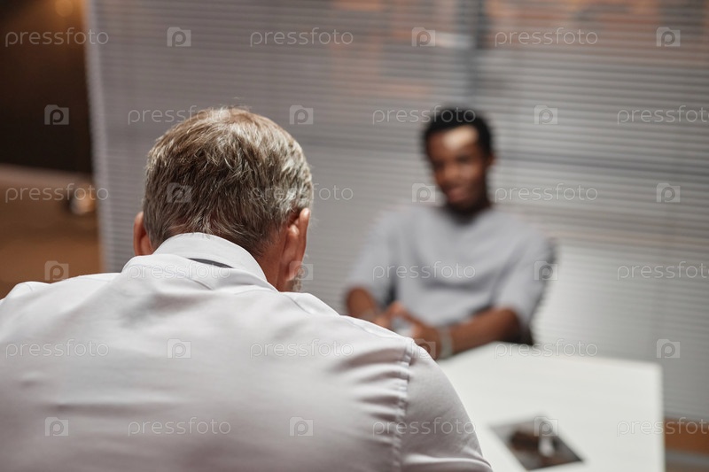Задний вид белокожего детектива, допрашивающего подозреваемого в преступлении
