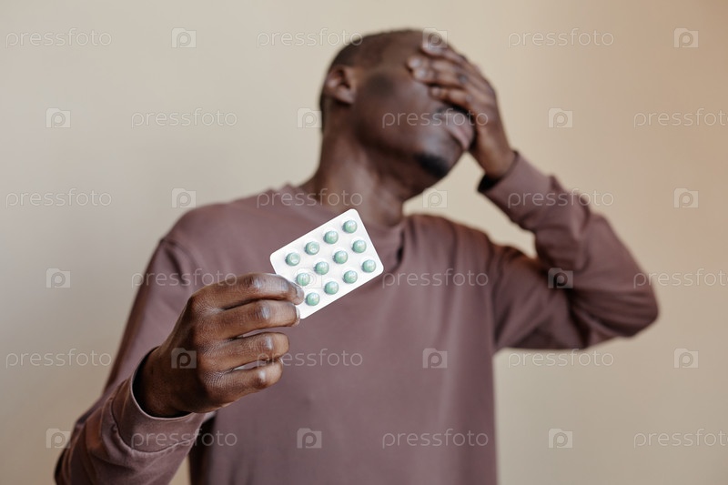 Чернокожий мужчина держит пузырь с таблетками перед камерой