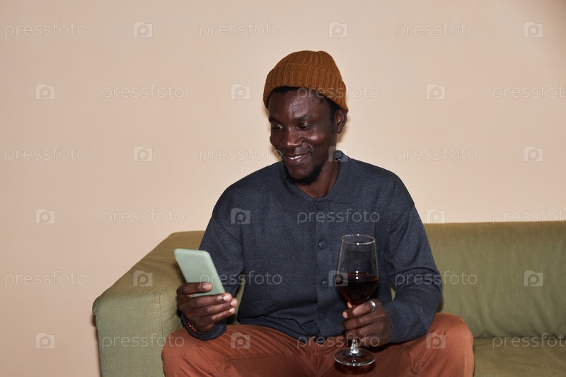Минимальный молодой чернокожий мужчина, использующий смартфон и пьющий красное вино