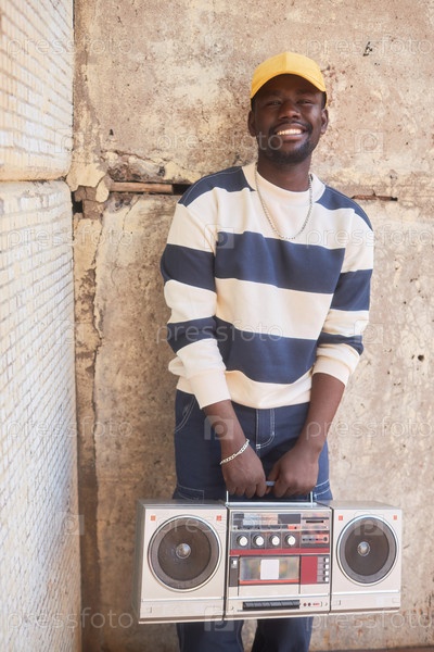 Улыбающийся чернокожий мужчина держит бумбокс на бетонном фоне в городской обстановке