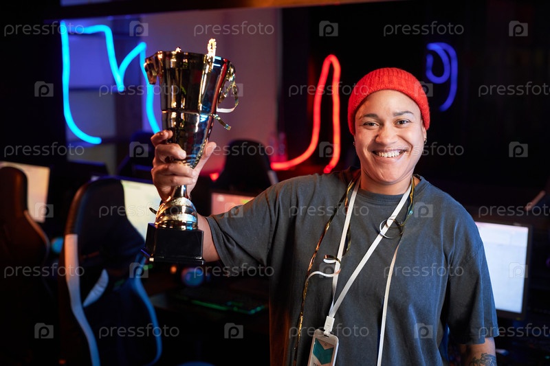 Улыбающаяся чернокожая женщина празднует победу в турнире по киберспорту