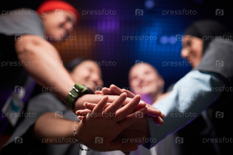 Близкий снимок женской команды, складывающей руки в единстве