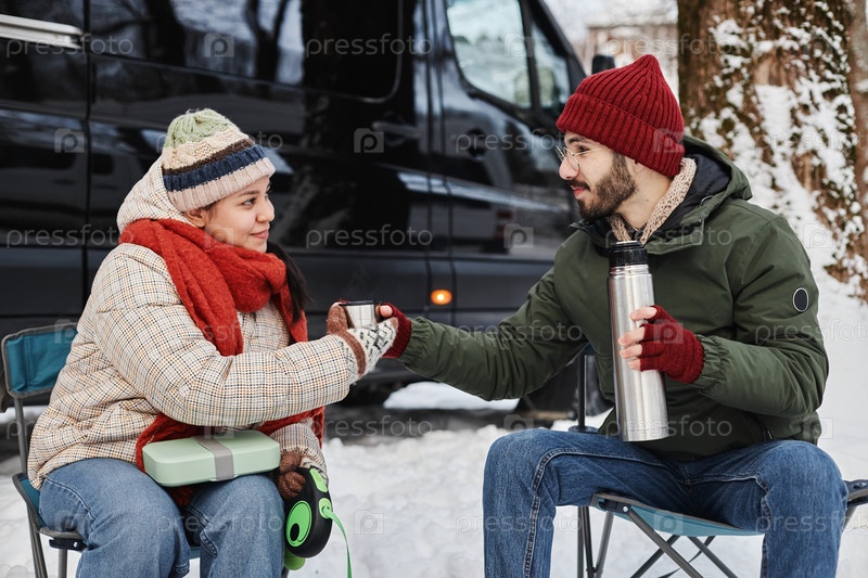Молодая путешествующая пара делит чашку горячего какао в фургоне зимой