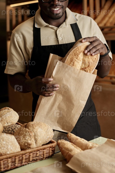 Молодой человек кладет свежий хлеб в бумажный пакет, обслуживая клиента в пекарне