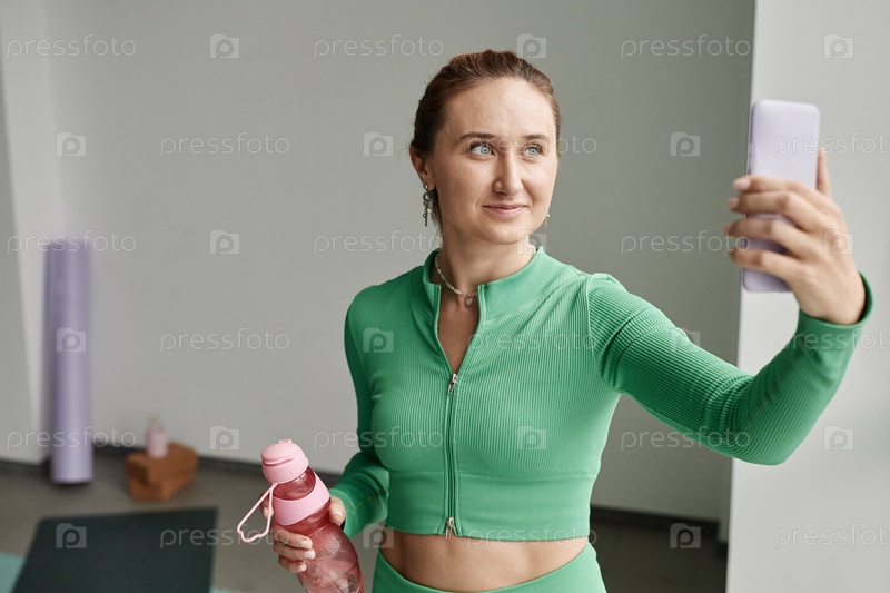Взрослая женщина, одетая в зеленую тренировочную одежду и делающая селфи на йога-студии