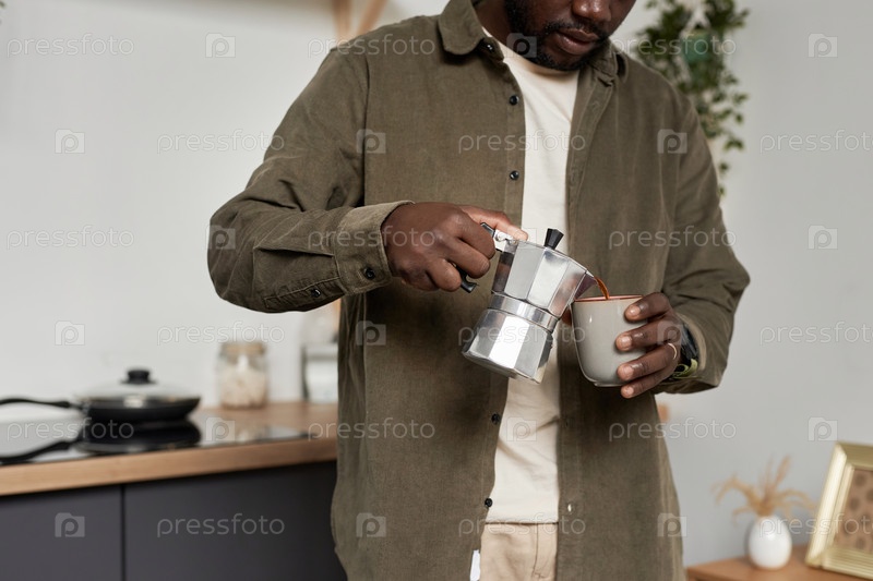 Близкий снимок чернокожего мужчины, готовящего чашку вкусного кофе дома утром