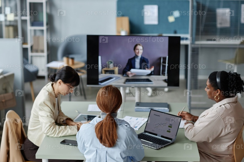 Работницы компании на онлайн-встрече в офисе