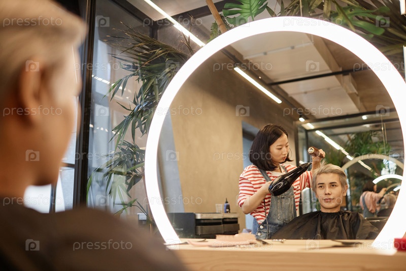 Отражение отражения парикмахера Сушка и стилирование волос в салоне красоты Mirror