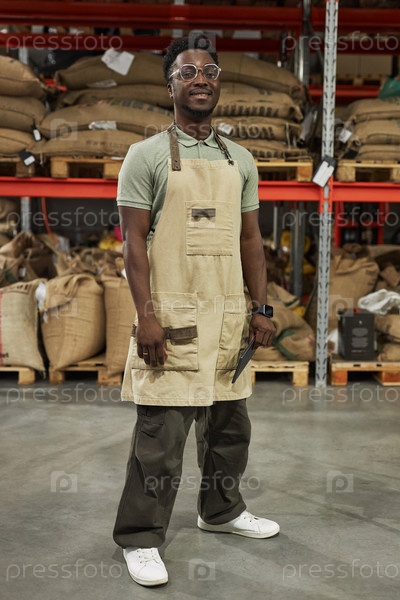 Чернокожий мужчина улыбается на камеру и носит фартук, стоящий в кафе-магазине