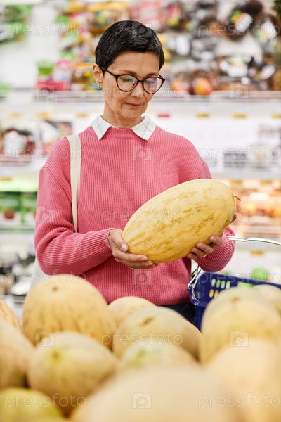 Женщина держит дыню, выбирая фрукты в супермаркете