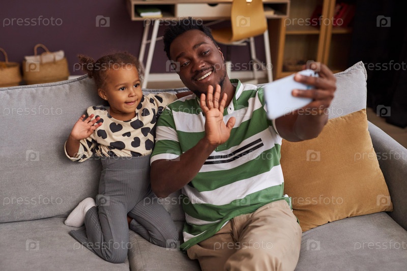 Счастливый чернокожий отец делает селфи с маленькой дочерью дома