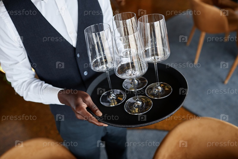 Близость к классическому официанту, держащему поднос с кристаллическими бокалами