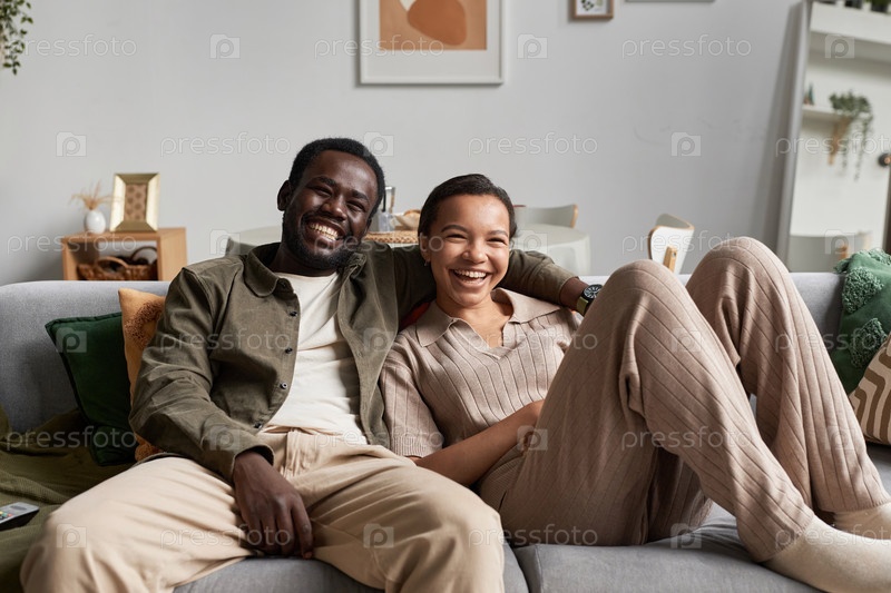Молодая афроамериканская пара вместе смотрит телевизор и счастливо смеется