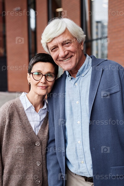 Улыбающаяся старшая пара стоит на улице в городе и смотрит на камеру