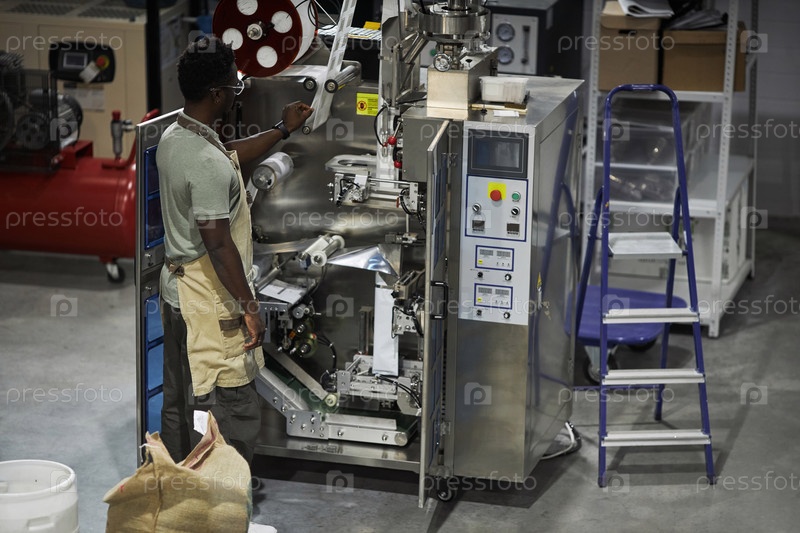 Чернокожий рабочий устанавливает упаковочную машину на кофейной фабрике