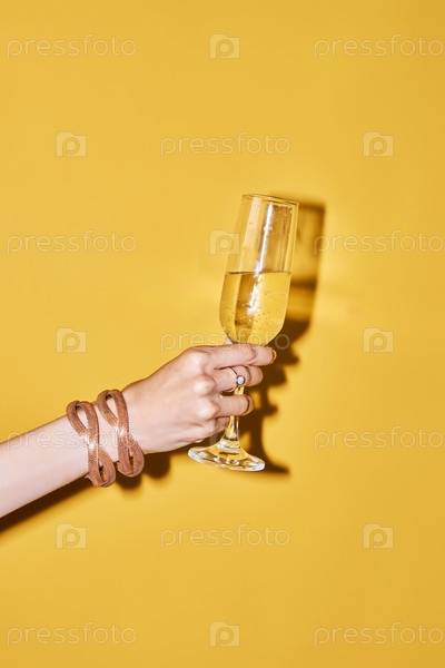 Женская рука держит высокий бокал шампанского в знак праздника против желтого