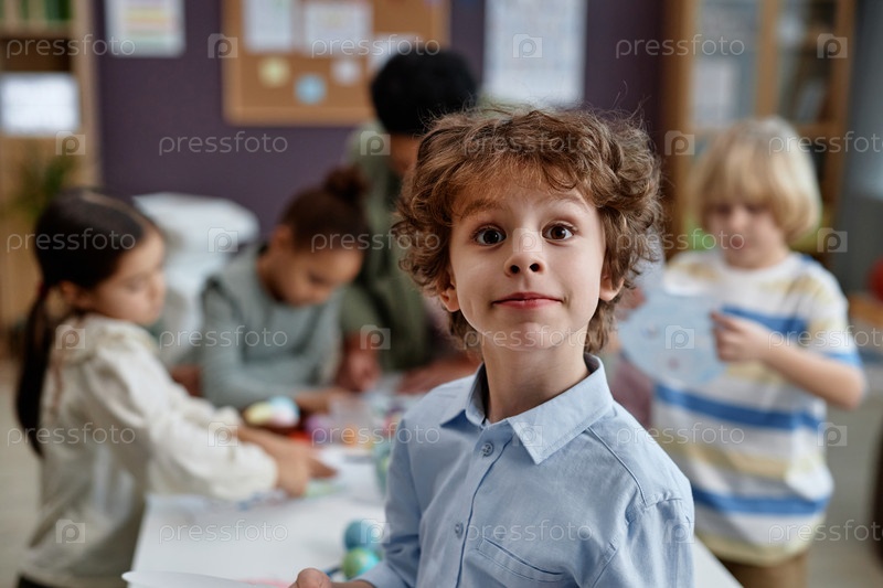 Милый кудрявый мальчик смотрит на камеру, наслаждаясь классом искусств и ремесел
