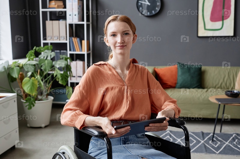 Молодая женщина использует инвалидное кресло и держит планшет в офисе