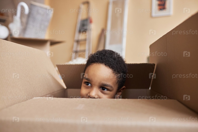 Лицо милого мальчика, заглядывающего из большой картонной коробки и смотрящего в сторону