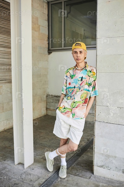Молодой азиатский мужчина смотрит на камеру городской одетый в красочный костюм
