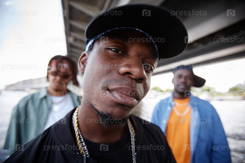 Молодой стильный лидер хип-хоп группы мальчиков в черной шляпе смотрит на камеру